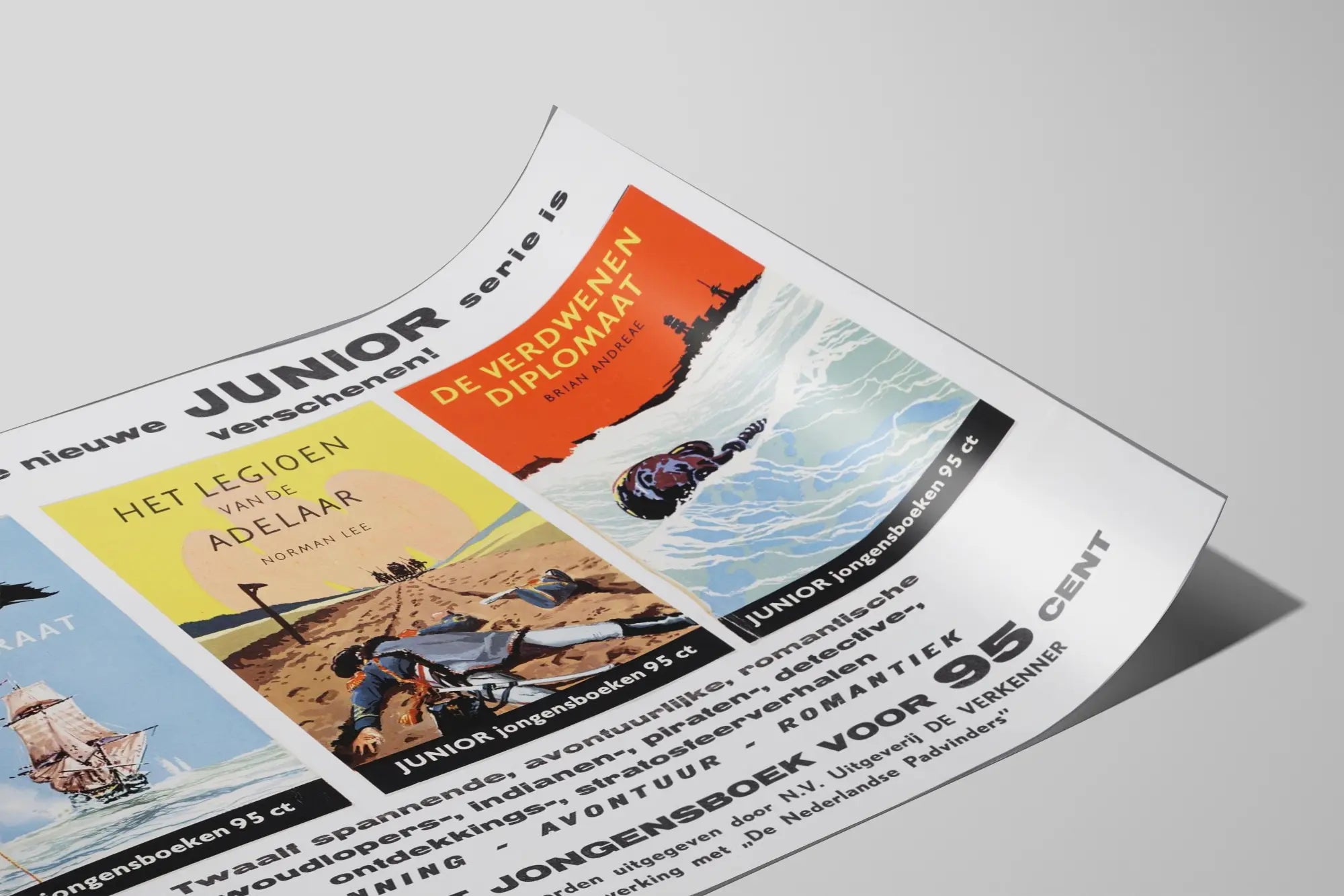 Deze vintage poster toont een boeiende serie voor jongeren, getiteld « Junior », met drie avontuurlijke boeken. Elke poster roept een eigen wereld op: « De spookpiraat » toont een piratenschip met een zwart vlaggetje versierd met een schedel op een blauwe hemelachtergrond, « Het legioen van de Adelaar » beeldt een dramatisch tafereel uit met gevallen soldaten op een weg onder een grote roodachtige zon, en « De verdwenen diplomaat » stelt een onstuimige zee voor met op de achtergrond een silhouet van een ver weg liggend gebouw. Deze werken illustreren perfect het thema van wanddecoratie met krachtige en expressieve grafische elementen, ideaal voor een kinderkamer of een leeshoek. Het kleurenpalet is gevarieerd, van rustgevend blauw tot fel geel en intens oranje, wat dynamiek en energie brengt in deze posters. Deze serie is ontworpen om de verbeelding van jonge avontuurliefhebbers en mysteriezoekers te vangen, door elementen van piraterij, strijdende legioenen en diplomatieke spionage te combineren. Ze roepen ook een romantische en gedurfde sfeer op, perfect om een wanddecoratie te verrijken met een vleugje nostalgie en ontdekkingsdrang. Deze posters vormen een uitstekende keuze voor liefhebbers van wanddecoratie die een vintage en verhalende sfeer in hun interieur willen brengen.