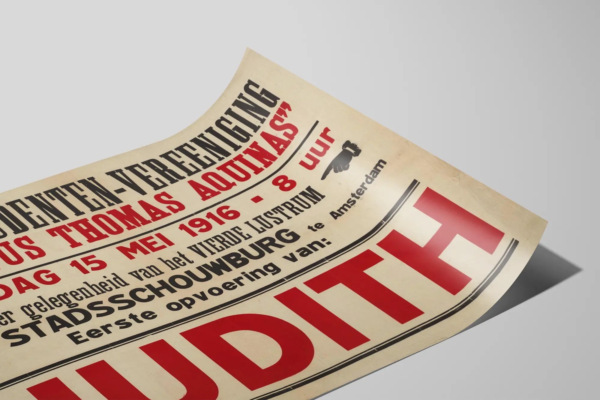 Deze vintage poster is een uniek wanddecoratiestuk voor liefhebbers van geschiedenis, theater en retro design. Hij kondigt de eerste voorstelling van het stuk "Judith" aan op maandag 15 mei 1916 om 8 uur, georganiseerd door de studentenvereniging R.K. Studenten-Vereeniging "Sanctus Thomas Aquinas" in het Stadsschouwburg in Amsterdam. Deze poster onderscheidt zich door zijn grafische stijl die typisch is voor het begin van de 20e eeuw, met een lay-out in grote, zwarte en rode hoofdletters die de belangrijkste informatie benadrukken, waaronder de titel "JUDITH" in zeer groot rood lettertype in het midden. De tekst wisselt tussen dikke en dunne lettertypes, wat een interessant visueel contrast biedt, vergezeld van zwarte indexsymbolen die wijzen naar de datum en tijd. Deze poster is een uitstekende keuze voor wanddecoratie in een interieur waar vintage en typografische elegantie gewaardeerd worden. Ze brengt een herkenbare historische charme, die verwijst naar de wereld van de Nederlandse katholieke studentenverenigingen en hun culturele betrokkenheid. Door deze poster aan een muur te hangen, wordt zowel een sfeer van culturele reflectie als een uitgesproken stijl uitgedragen, die authenticiteit en retro-esthetiek combineert. Het formaat van deze poster maakt het mogelijk om elk detail te benadrukken, van de letterzetting tot de algemene compositie, en biedt zo een meeslepende leeservaring en een blijvende visuele aantrekkingskracht. Ideaal voor een woonkamer, kantoor of een ruimte gewijd aan kunst en cultuur, belichaamt deze wanddecoratie een direct getuigenis van een specifiek cultureel evenement uit 1916, en onderstreept het de betekenis van studentenverenigingen in het artistieke leven van Amsterdam. Deze decoratieve poster is ook perfect voor verzamelaars van historische affiches of om een thematische muurgalerij over theater en podiumkunsten te verrijken. Samengevat is deze "Judith" poster uit 1916 veel meer dan een eenvoudige wanddecoratie: het is een fragment van visuele geschiedenis, een eerbetoon aan een tijdperk en een culturele traditie gedragen door gepassioneerde studenten.