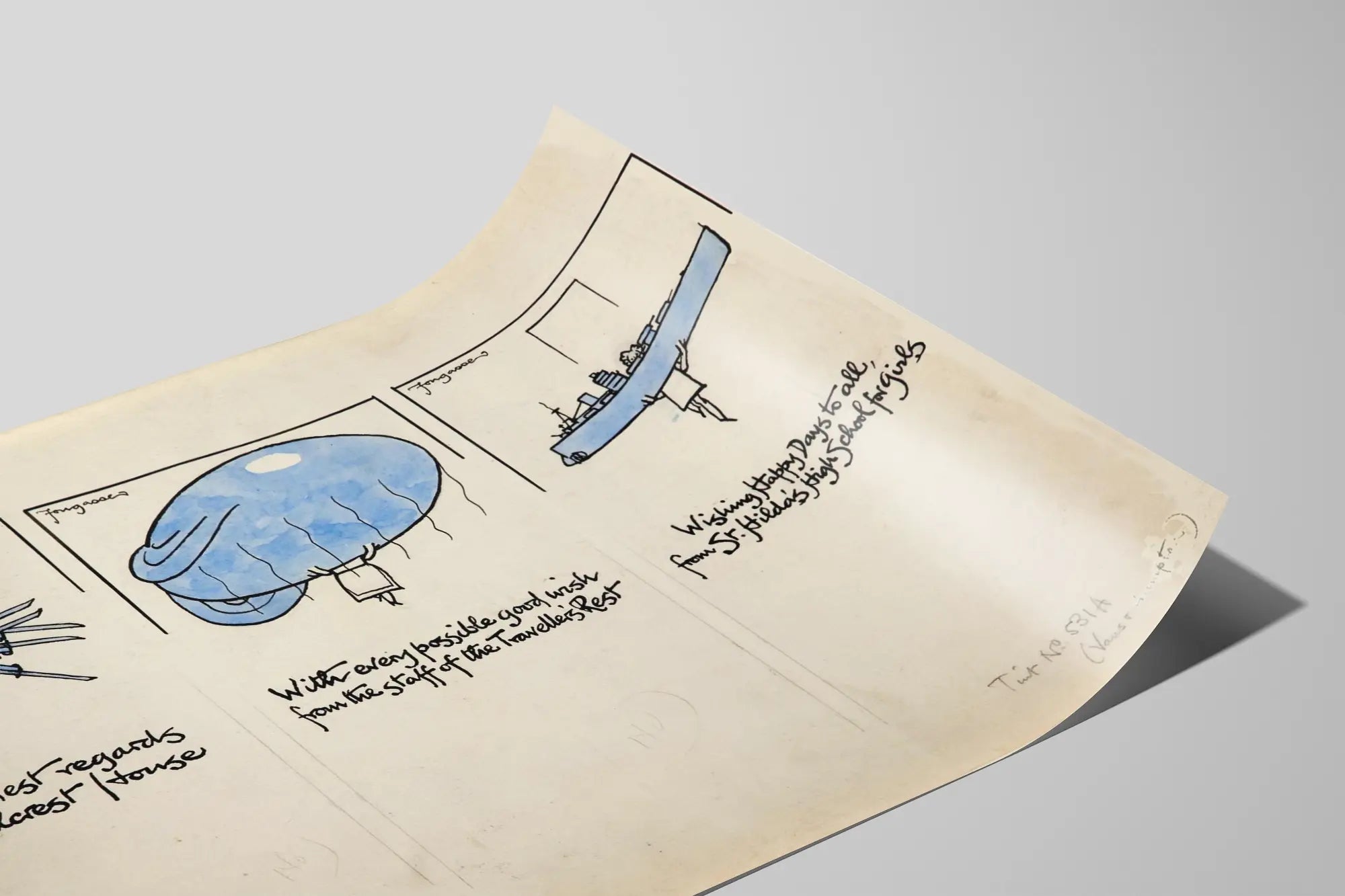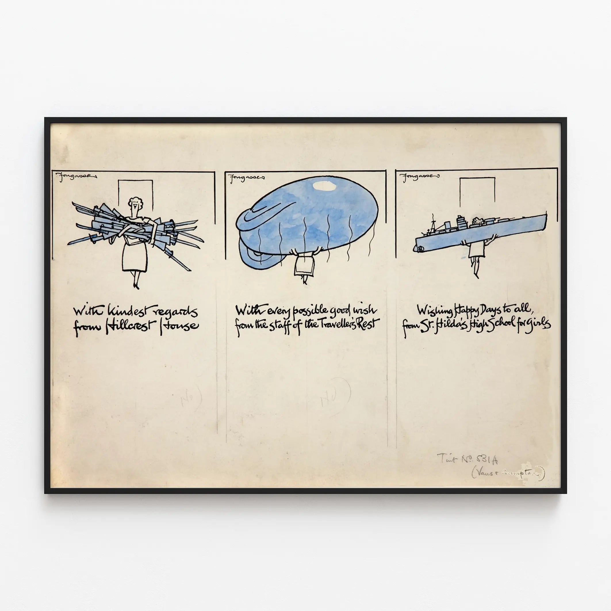 Ontdek deze originele vintage poster die drie vrouwelijke figuren afbeeldt, getekend in een cartoonstijl. Elk personage houdt een symbolisch voorwerp vast: de eerste vrouw draagt een groep geweren, de tweede heft een grote blauwe ballon, terwijl de derde een groot oorlogsschip voorstelt. Deze muurschildering speelt met het contrast tussen eenvoudige lijntekeningen en het gebruik van kleur alleen op bepaalde elementen. Elke scène wordt begeleid door een handgeschreven tekst in het Engels die lijkt te bestaan uit wensberichten van verschillende instellingen, wat een narratief en historisch tintje aan het kunstwerk toevoegt. Deze poster is ideaal voor liefhebbers van originele muurdecoratie, die humor en iconografische verwijzingen combineert, perfect voor een interieur in retro- of eclectische stijl. De lichte en eenvoudige stijl maakt het ook een interessante keuze voor een kantoor of een ruimte gewijd aan creativiteit. Het werk toont een triptych-opstelling en een visuele harmonie gebaseerd op zwart en blauw, wat zijn grafische en aantrekkelijke karakter versterkt. Of het nu is om een woonkamermuur, een bibliotheek of een artistieke ruimte te decoreren, deze unieke affiche brengt een vleugje authenticiteit en persoonlijkheid in uw inrichting. U zult deze poster waarderen vanwege het sobere maar suggestieve ontwerp, dat illustratie en handschrift combineert in een zeer trendy vintage sfeer.