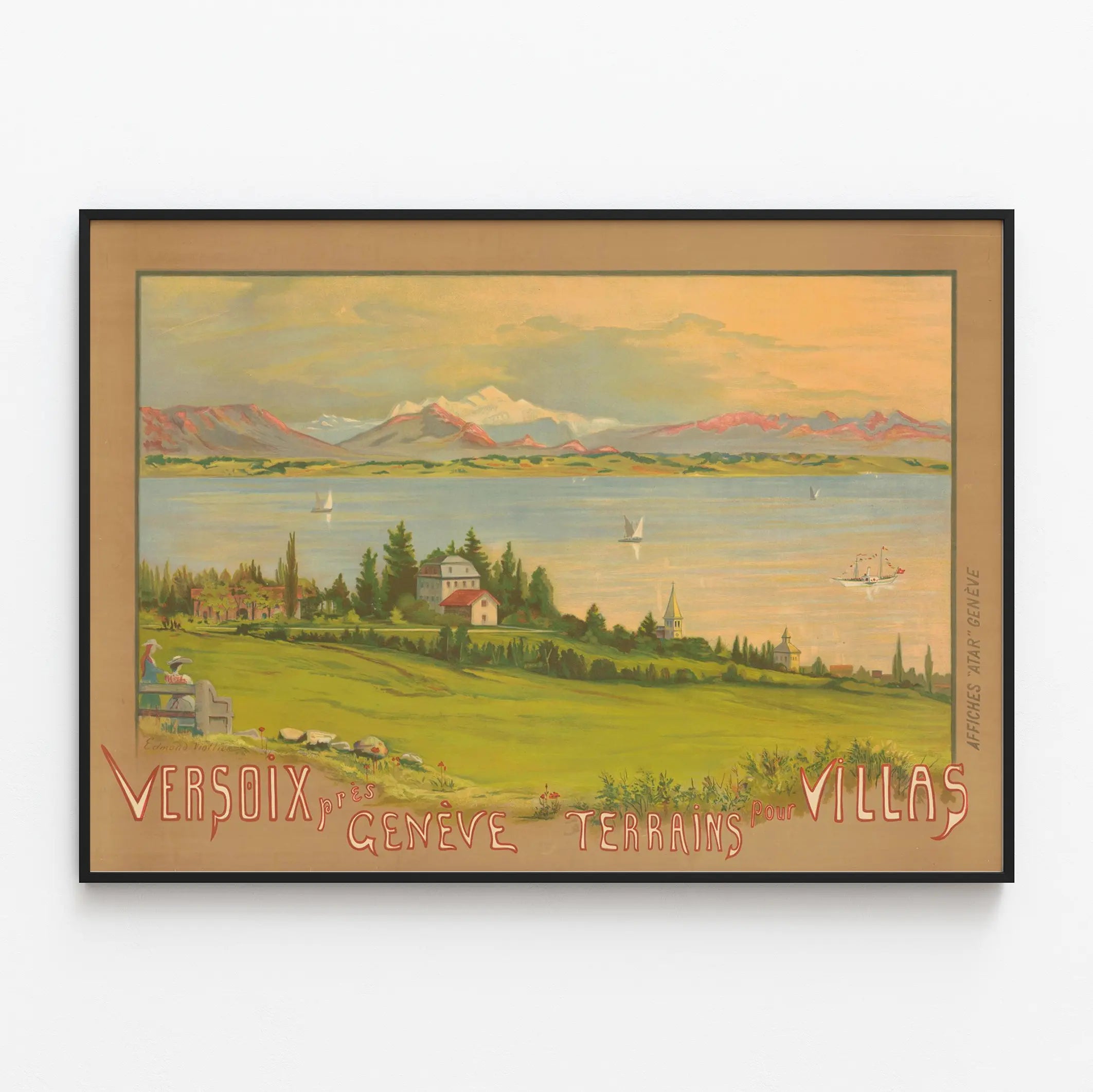 Deze vintage poster toont een schilderachtig landschap van Versoix, een charmant dorpje nabij Genève, met een focus op bouwgrond bestemd voor villa's. Deze wanddecoratie vangt een rustgevend uitzicht met een uitgestrekt groen veld op de voorgrond, ideaal voor vastgoedprojecten, vergezeld van een meerpanorama waar enkele zeilboten en een stoomboot drijven, wat de rustige en prestigieuze sfeer van de locatie versterkt. Op de achtergrond is een bergketen met besneeuwde toppen zichtbaar, die een spectaculaire visuele diepte en een vleugje majestueuze natuur aan de compositie toevoegt. Deze affiche onderscheidt zich door zijn klassieke artistieke stijl, zowel zacht als kleurrijk, die de tijdloze charme van traditionele Zwitserse landschappen oproept. De handgeschreven tekst in rode en witte letters benadrukt de commerciële boodschap van deze oude aankondiging, en onderstreept de mogelijkheid om een stuk grond te verwerven in deze aantrekkelijke regio nabij Genève. Als wanddecor is deze vintage poster perfect om een elegante en nostalgische sfeer toe te voegen aan een woonkamer, kantoor of ontvangstruimte, vooral voor liefhebbers van decoratie die het erfgoed en de natuurlijke schoonheid van de Alpenregio oproepen. Dit wandpaneel past harmonieus in een interieur dat een zowel klassieke als warme ambiance zoekt, en biedt een open venster op een rustige levensstijl aan het Meer van Genève. De affiche kan ook de geschiedenis- en stadsplanningsliefhebbers aanspreken, dankzij zijn informatieve en esthetische karakter. Dankzij de visuele kwaliteit en het suggestieve onderwerp is dit wanddecoratie een originele keuze om een ruimte te personaliseren met een vleugje karakter en authenticiteit.