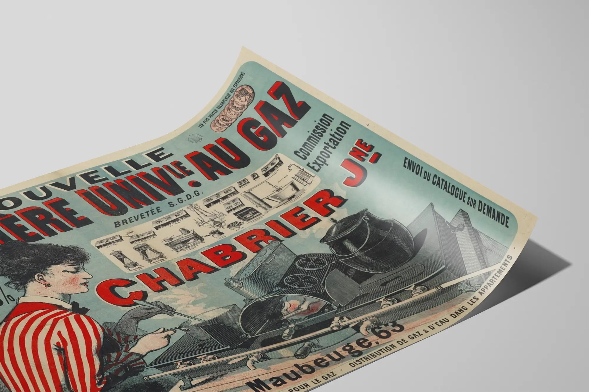 Ontdek dit vintage affiche die de "Nieuwe Universele Gasfornuis" van het merk Chabrier Jeune afbeeldt, een iconisch stuk oude reclame dat de voordelen van gas voor koken benadrukt. Deze retro-stijl affiche toont een jonge vrouw in gestreepte kleding, aandachtig bezig met het koken op een innovatief gasfornuis, en onderstreept de moderniteit en het gebruiksgemak van dit apparaat. De affiche belooft onder andere 50% besparing, netheid en gemak, sterke argumenten voor die tijd die liefhebbers van industriële en vintage muurdecoratie aanspreken.