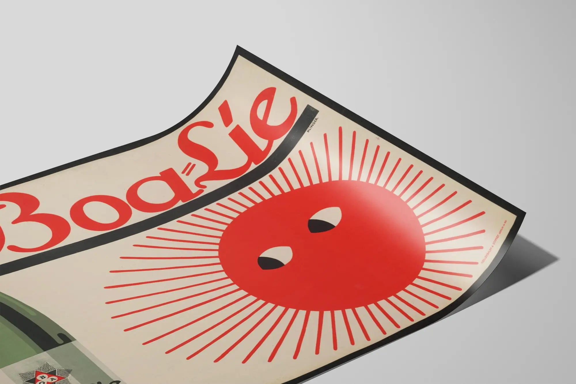 Ontdek dit vintage affiche die een reclame voor Boa-Lie illustreert, een product gepresenteerd als een gestileerde fles. Deze wanddecoratie afficheert een groene fles links met een gedetailleerd etiket en een inscriptie Boa-Lie in zwarte en rode cursieve letters. Rechts trekt een grote, felrode zon in retro grafische stijl de aandacht, met twee gestileerde ogen die een speelse en originele toets toevoegen. Het kleurenpalet, voornamelijk beperkt tot rood, groen, zwart en wit, creëert een krachtig contrast dat dynamiek en moderniteit aan dit artistieke stuk geeft. Perfect voor een vintage thema wanddecoratie of een collectie oude reclameposters, nodigt dit poster uit tot een reis door het grafisch ontwerp van het verleden. Of het nu gaat om een modern of klassiek interieur, deze Boa-Lie affiche brengt een vleugje authenticiteit en retro charme. Het eenvoudige maar impactvolle ontwerp maakt het ook tot een decoratief element dat de aandacht trekt en nieuwsgierigheid opwekt. Deze wanddecoratie is ideaal voor liefhebbers van grafische kunst, vintage of oude reclame, en past zowel in een woonkamer, keuken als kantoor. De combinatie van cursieve typografie, geometrische stijl en het visuele spel tussen de fles en de zon zorgen voor een mooie harmonie in dit muurschilderij. Kies dit poster om je interieur te verrijken met een originele en karaktervolle grafische creatie.