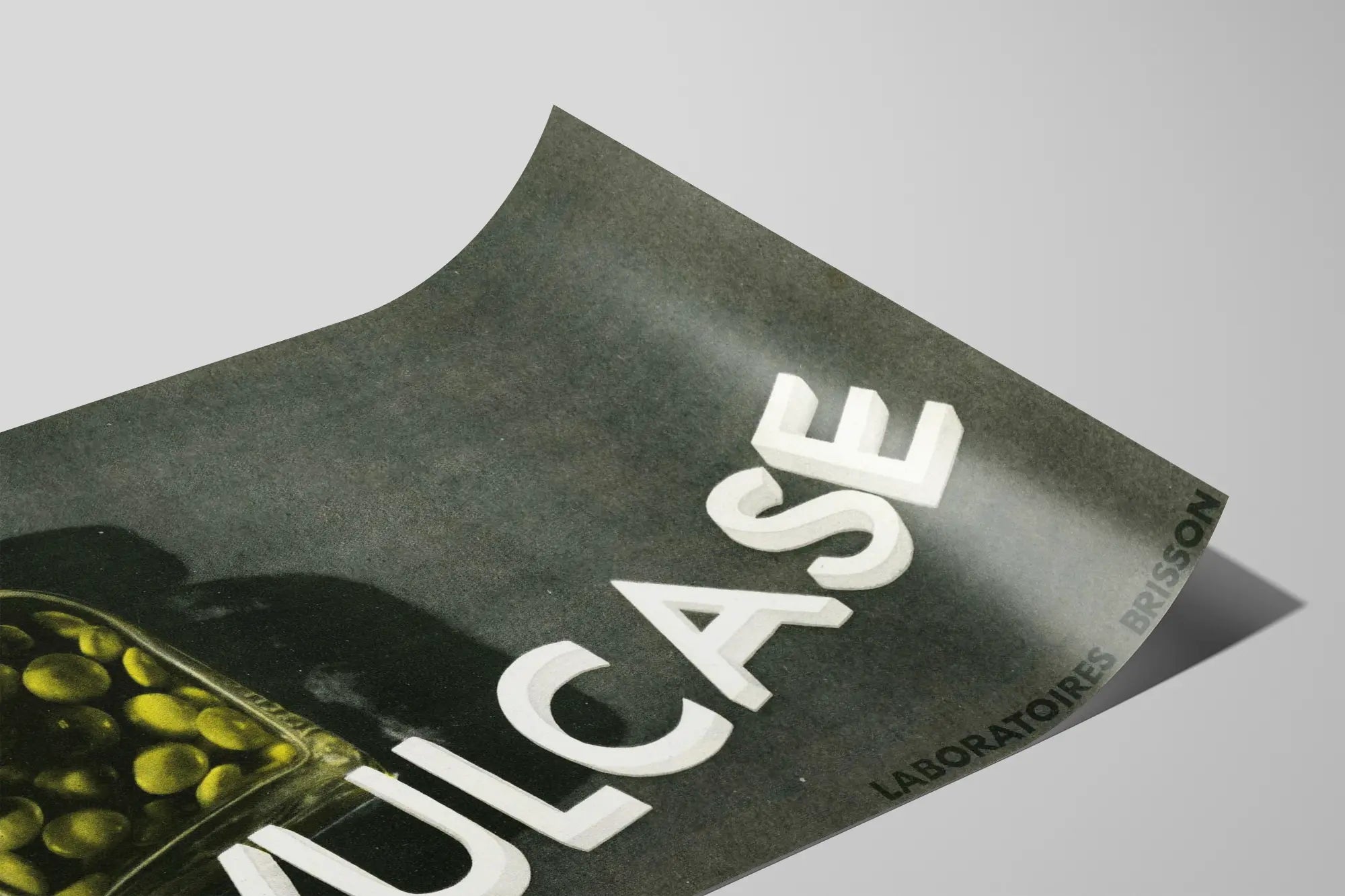 Dompel jezelf onder in de unieke wereld van wanddecoratie met dit vintage reclameposter Vulcase, ondertekend door Laboratoires Brisson. Deze vintage affiche toont een doorzichtig flesje gevuld met gele capsules of balletjes, dat een opvallend contrast vormt met de donkere achtergrond. De naam "VULCASE" is in witte, reliëfletters geschreven, wat een gevoel van diepte en dynamiek geeft en het een opvallend element maakt voor elke ruimte. Deze affiche speelt perfect met schaduw en licht, waardoor het vintage en retro karakter van de compositie wordt versterkt.