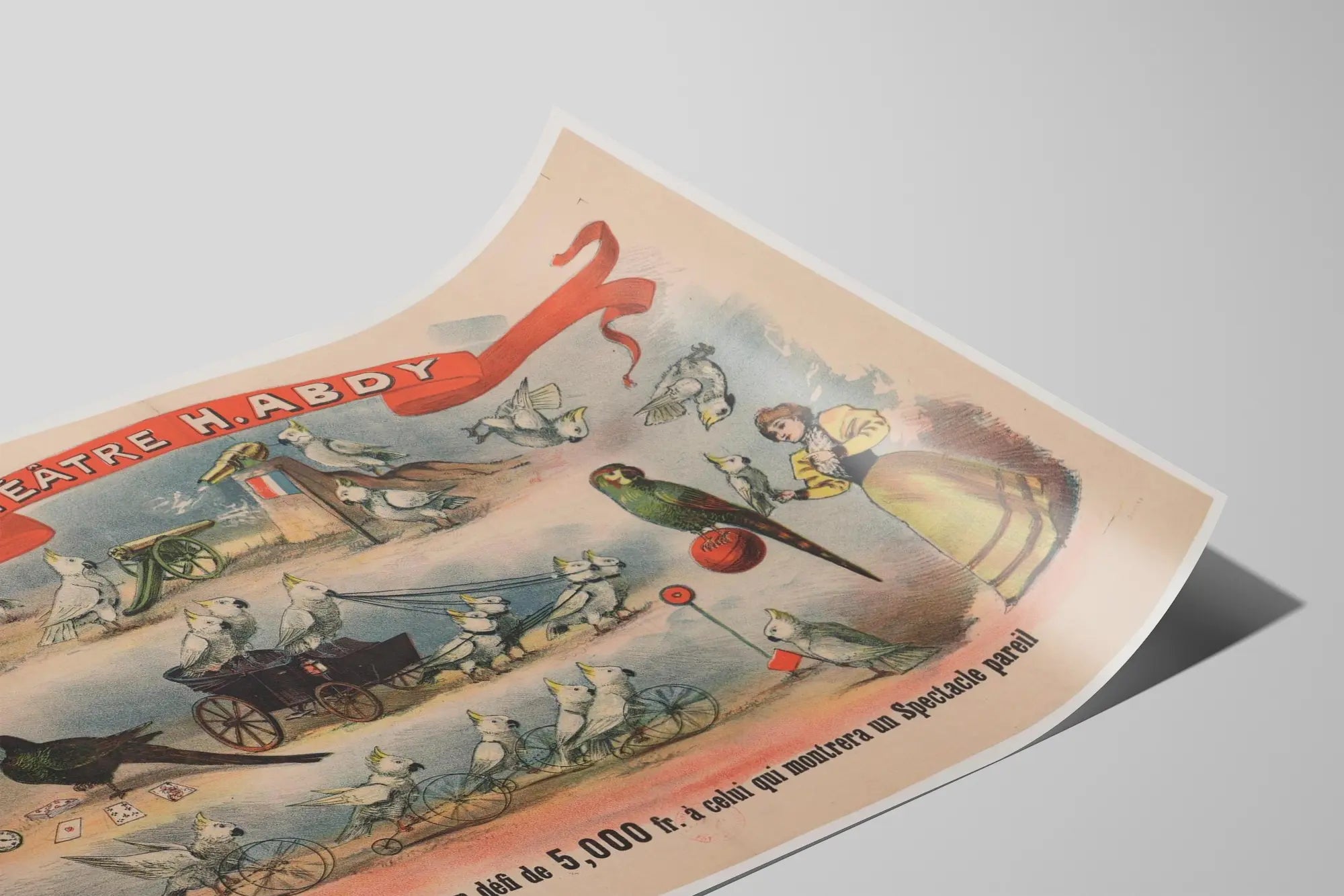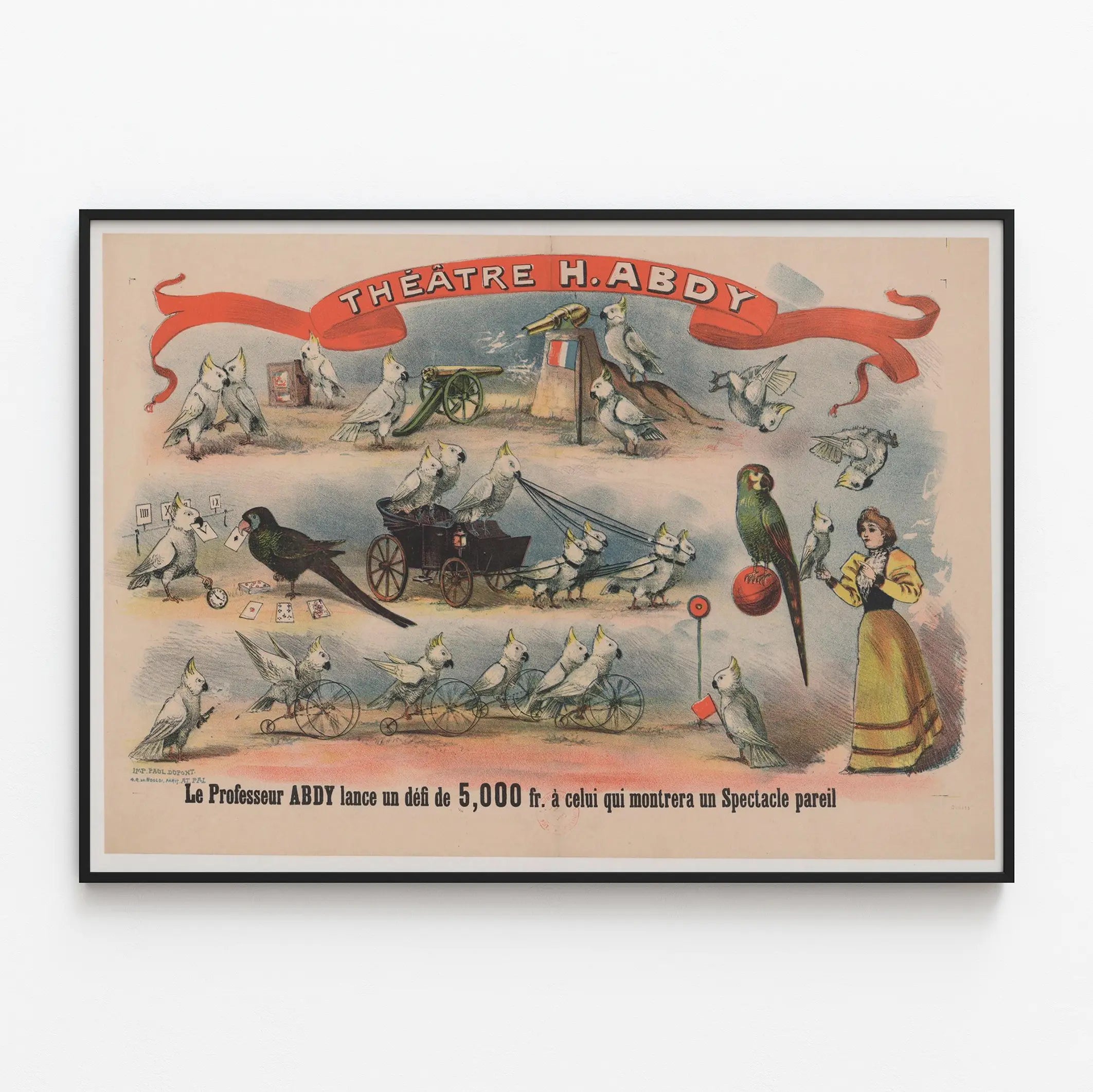 Deze originele vintage affiche van het Theater H. Abdy toont op charmante wijze een ongezien optreden met behendige papegaaien in diverse artistieke acts. De tekening benadrukt een reeks levendige scènes waarin exotische vogels, vooral witte en gekleurde papegaaien, trucs uitvoeren en voorwerpen manipuleren, waardoor een speelse en verrassende sfeer ontstaat. Tussen de scènes door zijn onder andere papegaaien te zien die een kleine kar trekken, met kaarten spelen, een wiel laten draaien of een Franse vlag vasthouden bij een kanon, wat een theatrale en originele opstelling benadrukt. Een vrouw in ouderwetse kostuum, waarschijnlijk de eigenares van de vogels, is eveneens aanwezig, wat de levendige aard van de scène versterkt. Bovenaan domineert een brede rode band met de naam van het theater. Onderaan moedigt een tekst aan om de uitdaging van Professor Abdy aan te gaan, met de belofte van een prijs van 5000 frank voor wie erin slaagt een vergelijkbaar optreden te presenteren. Deze poster is een mooi voorbeeld van vintage wanddecoratie die liefhebbers van oude grafische kunst en theateraffiches zal aanspreken. Het palet van pastelkleuren, gecombineerd met levendige accenten, brengt een nostalgisch tintje dat perfect is om een interieur te verfraaien met een retro en originele sfeer. Deze wanddecoratie is ideaal voor een woonkamer, kantoor of privétheaterzaal, en voegt een vleugje elegantie en nieuwsgierigheid toe dankzij zijn dieren- en theaterwereld. Perfect als verzamelobject of om een collectie oude affiches te verrijken, is deze poster een uitnodiging om terug te keren naar de fascinerende wereld van dierenvoorstellingen uit het verleden.