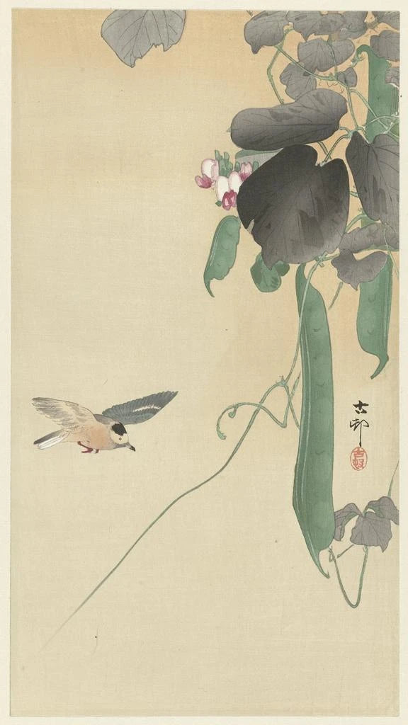 Kunstdruk | Vogel op boonplant in bloei - Ohara Koson