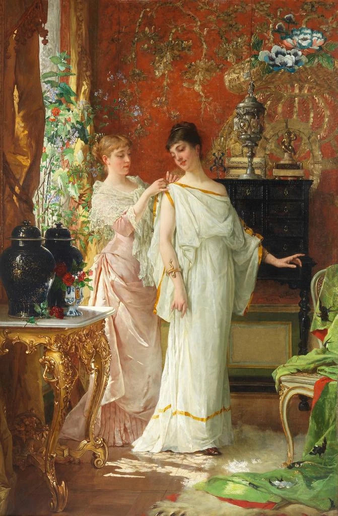 De kunstdruk van "Préparatifs" is een decoratief stuk dat elke ruimte kan verrijken, of het nu een woonkamer, kantoor of slaapkamer is. De kwaliteit van de kunstdruk garandeert een opmerkelijke fideliteit aan de kleuren en details van het originele werk, waardoor een vleugje elegantie en sereniteit aan uw interieur wordt toegevoegd. Met zijn esthetische aantrekkingskracht nodigt dit schilderij uit tot contemplatie en dromerij, en creëert het een warme en gastvrije sfeer. Door voor dit doek te kiezen, kiest u voor een kunstdruk die niet alleen verfraait, maar ook een verhaal vertelt, dat van een moment dat in de tijd is stilgezet.