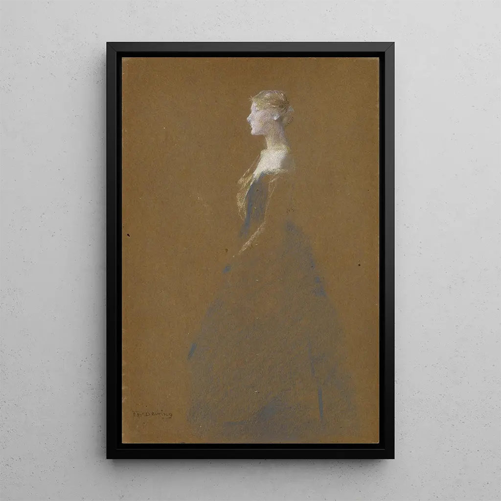 Thomas Dewing, actief aan het einde van de 19e en het begin van de 20e eeuw, wordt vaak geassocieerd met de Amerikaanse impressionistische beweging. Zijn carrière wordt gekenmerkt door een verkenning van thema's als vrouwelijkheid en natuur, beïnvloed door zijn tijdgenoten en Europese kunststromingen. Dewing ontwikkelde een unieke stijl, die een moderne gevoeligheid combineert met traditionele technieken. "Femme en robe bleue" belichaamt perfect deze zoektocht naar harmonie tussen mens en natuur, terwijl het de tijdloze schoonheid van zijn vrouwelijke modellen benadrukt, vaak afgebeeld in contemplatieve poses.