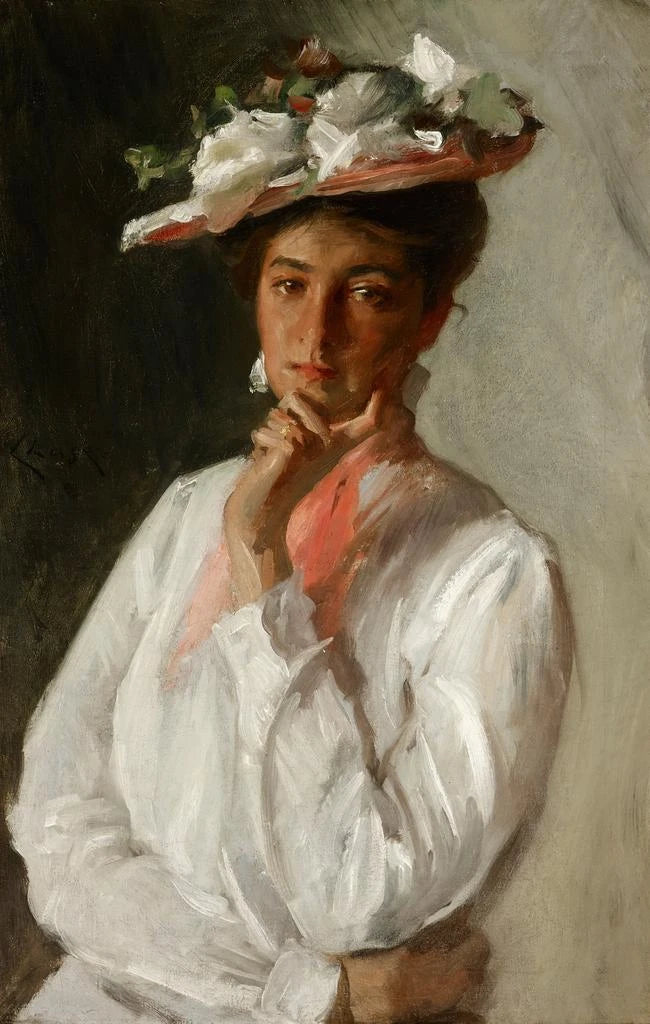 William Merritt Chase, een iconische figuur van het Amerikaanse impressionisme, wist Europese invloeden te combineren met een unieke stijl. Geboren in 1849, studeerde hij aan de Münchner Kunstacademie, waar hij beïnvloed werd door kunstenaars als Manet en Monet. Chase speelde een cruciale rol in de introductie van het impressionisme in Amerika, door tentoonstellingen te organiseren en les te geven aan generaties kunstenaars. Zijn kunstwerk, "Femme en blanc", getuigt van zijn vaardigheid om licht en kleur vast te leggen, terwijl hij thema's van het dagelijks leven en vrouwelijke schoonheid verkent.