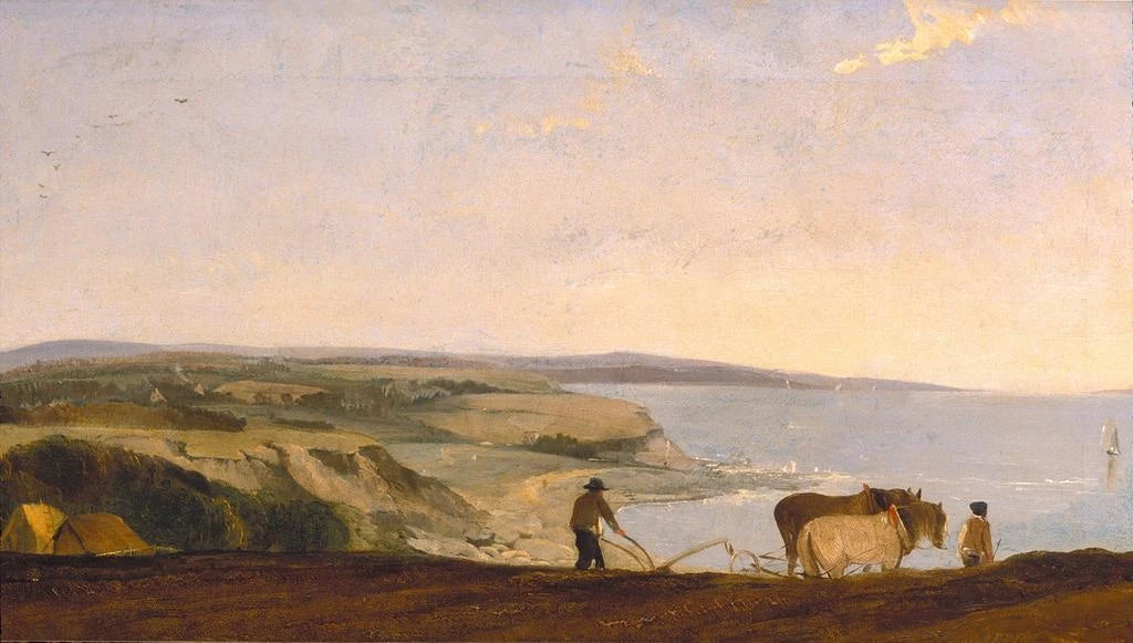 De kunstdruk van Vue près de Weymouth brengt de kijker naar een vredig landschap, waar het zachte ochtendlicht de groene heuvels en kalme wateren verlicht. De tinten groen en blauw mengen zich subtiel, waardoor een sfeer van rust en contemplatie ontstaat. De olieverftechniek, kenmerkend voor John Crome, stelt je in staat om de subtiele details van de natuur vast te leggen, van het gebladerte tot de reflecties in het water. Dit schilderij nodigt uit tot ontsnapping, ademhalen van de frisse lucht van het Engelse platteland, terwijl je geniet van de eenvoudige en authentieke schoonheid van de natuurlijke wereld.