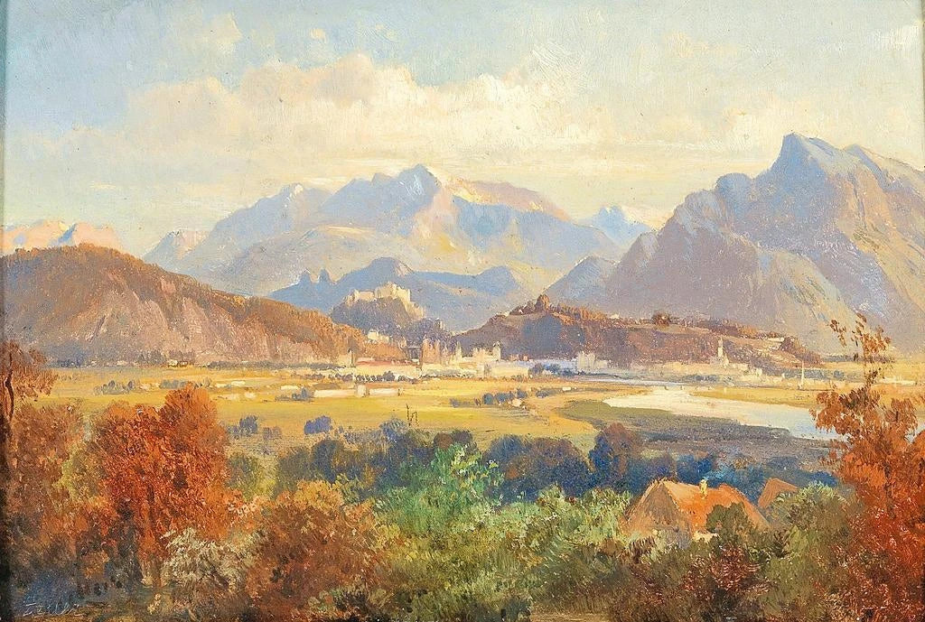 De kunstdruk van "Vue van Salzburg" dompelt ons onder in een majestueus landschap waar de stad zich gracieus uitstrekt te midden van een weelderige natuur. De zachte tinten van de omliggende heuvels versmelten harmonieus met de historische gebouwen, waardoor een serene en poëtische sfeer ontstaat. De olieverftechniek op doek stelt Friedrich Zeller in staat om het licht op een delicate wijze vast te leggen, waarbij schaduwen en reflecties op de gevels van de gebouwen worden benadrukt. Dit schilderij nodigt uit tot contemplatie en voert de kijker mee op een visuele reis door tijd en ruimte, waarin elk detail een verhaal vertelt.