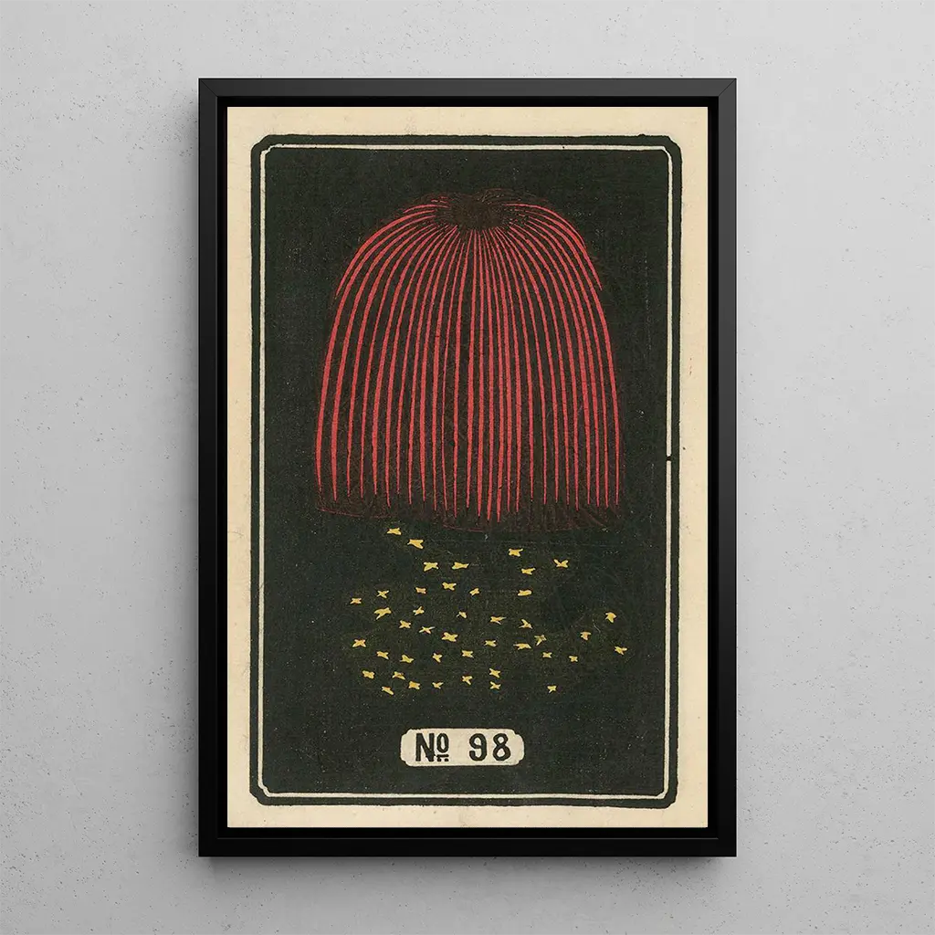 De "Feux d'artifice nocturnes n° 98" van Jinta Hirayama vangen de essentie van een feestelijke nacht waarin de lichtflitsen de hemel verlichten. Deze kunstdruk, rijk aan levendige kleuren en opvallende contrasten, roept een sfeer van vreugde en verwondering op. De nuances van diepblauw, vurend rood en fonkelend goud mengen harmonieus, waardoor een visuele dans ontstaat die de blik trekt. De techniek van de kunstenaar, die delicate penseelstreken combineert met lichtflitsen, brengt elke explosie tot leven en transformeert het doek in een levendig spektakel. Het kunstwerk nodigt de kijker uit om onder te dompelen in een wereld van magie en viering.