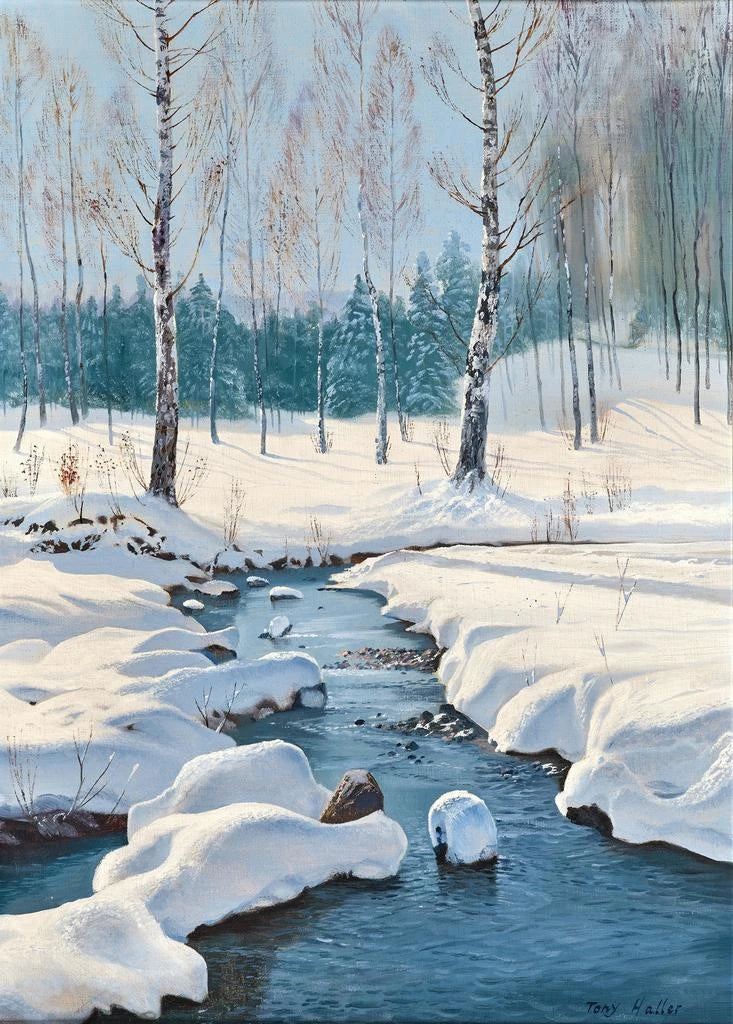 Le tableau Paysage d'hiver avec un ruisseau nous plonge dans un univers paisible où la neige recouvre délicatement le sol et les arbres. La scène est animée par un ruisseau qui serpente à travers le paysage, ajoutant une touche de mouvement à cette tranquillité hivernale. Les nuances de blanc, de bleu et de gris se mêlent harmonieusement, créant une atmosphère douce et apaisante. La technique de peinture de Toni Haller, avec ses coups de pinceau délicats, permet de rendre la fraîcheur de l'air et la beauté éphémère de l'hiver, invitant le spectateur à ressentir la magie de cette saison.
