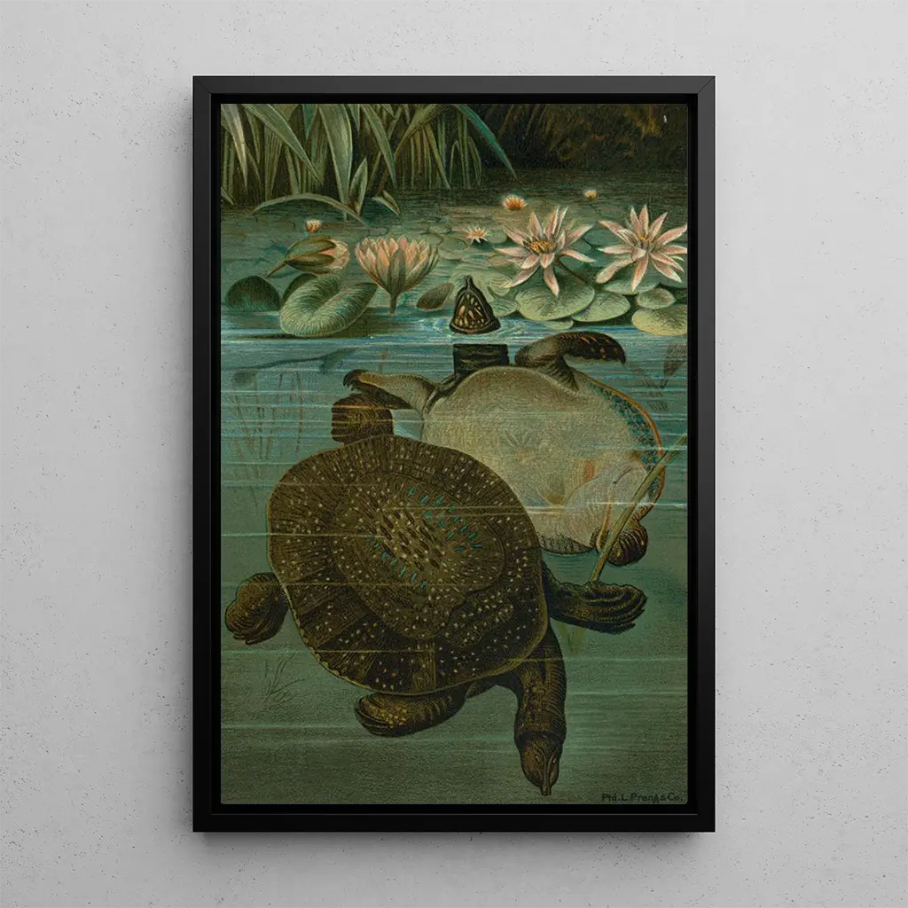 In "Tortues molles" nodigt John George Wood ons uit om de discrete schoonheid van deze waterreptielen te verkennen. Het kunstdruk, rijk aan details, benadrukt de unieke textuur van de schild van de tortues, evenals hun natuurlijke omgeving. De aardse kleuren en nuances van groen creëren een rustgevende sfeer, die de rust van rivieren en meren oproept. De techniek van Wood, die aquarel en tekening combineert, brengt deze wezens tot leven en geeft ze een bijna tastbare aanwezigheid. Dit schilderij is een viering van het waterleven, een eerbetoon aan de diversiteit van de soorten die onze ecosystemen bevolken.