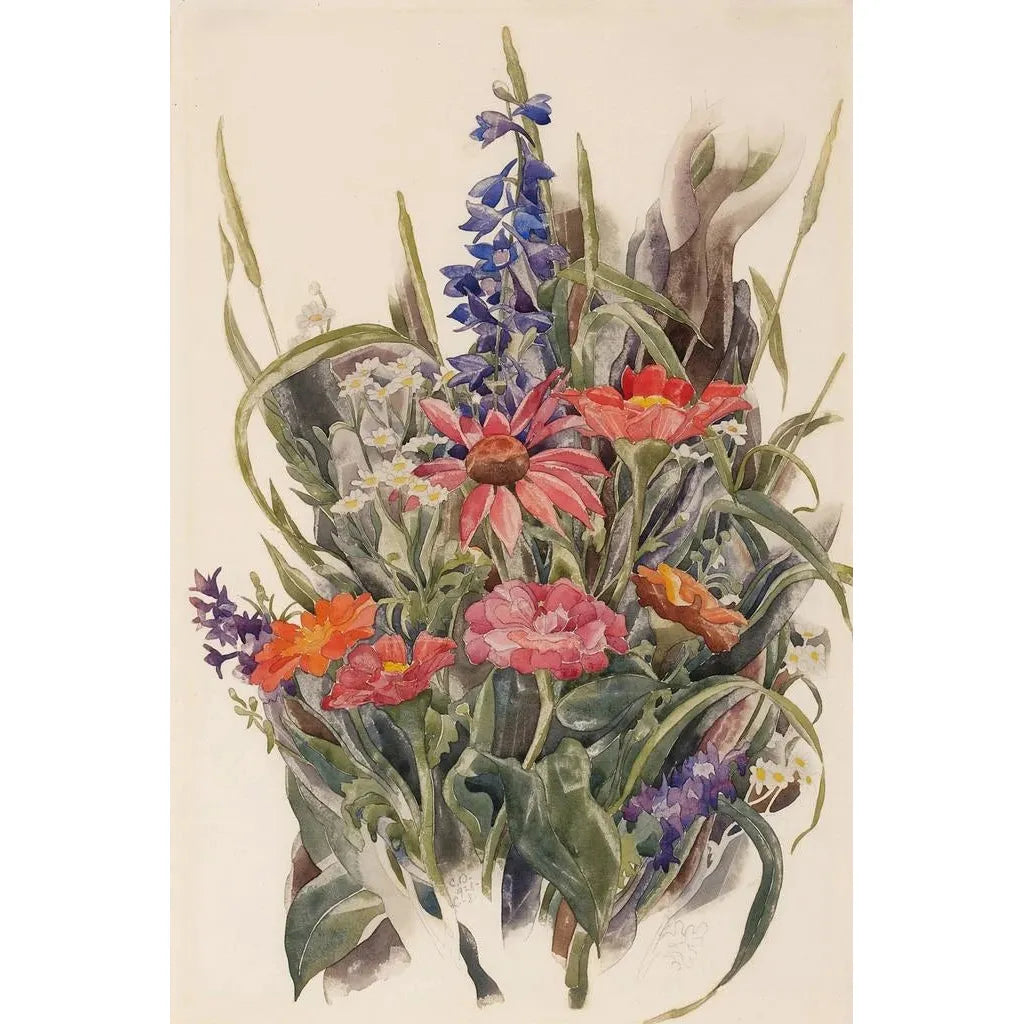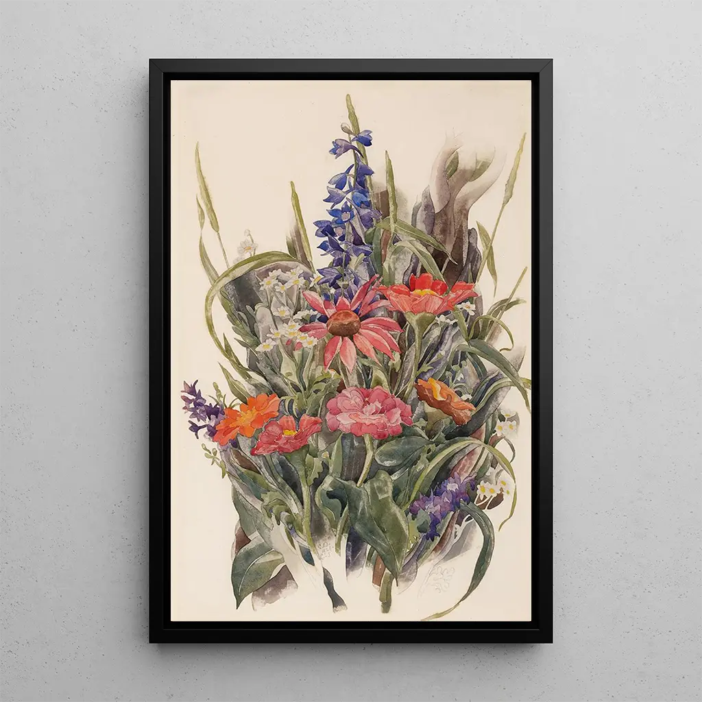 In dit levendige kunstdruk vangt Charles Demuth de vergankelijke schoonheid van bloemen met een stralend palet. De zinnias, delphiniums en margrieten verweven zich met een verbluffende fijnheid, waardoor een harmonieuze compositie ontstaat die uitnodigt tot contemplatie. De aquareltechniek, vakkundig toegepast, laat het licht spelen op de bloemblaadjes en subtiele nuances zien die de frisheid van een bloeiend tuin suggereren. De algemene sfeer van de kunstdruk is zowel vrolijk als rustgevend, en transporteert de kijker naar een wereld waarin de natuur in al haar pracht bloeit.