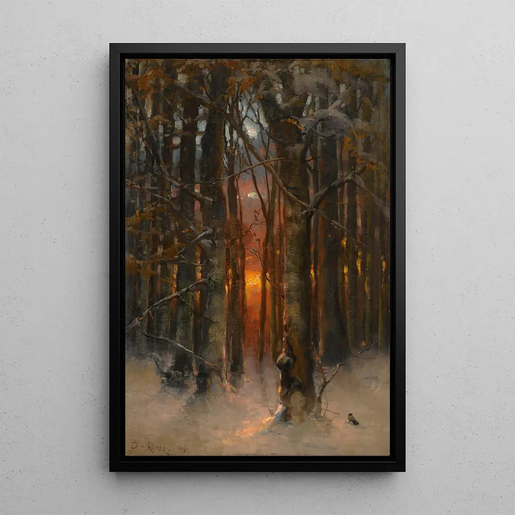 In deze kunstdruk van de Zonsondergang door de bomen biedt Julius Sergius Klever ons een scène van verbluffende schoonheid, waar het zonlicht zich mengt met dicht bladerdek. De warme tinten oranje en roze vloeien harmonieus samen, waardoor een rustgevende en contemplatieve sfeer ontstaat. De techniek van Klever, gekenmerkt door delicate penseelstreken en bijzondere aandacht voor details, brengt dit natuurlijke landschap tot leven. Elk element, van de boomstammen tot de weerspiegelingen in de lucht, draagt bij aan een evenwichtige compositie die uitnodigt tot dromen en ontsnapping.