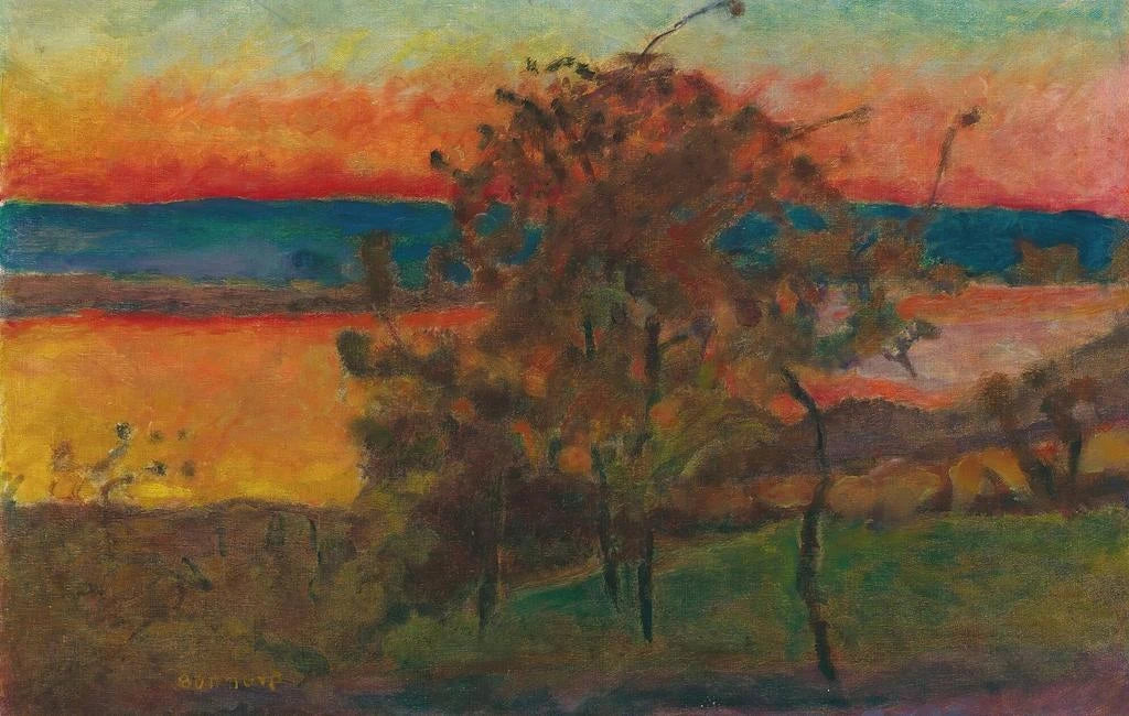 Pierre Bonnard, iconisch figuur van het post-impressionisme, wist de schoonheid van alledaagse momenten vast te leggen met een unieke gevoeligheid. Geboren in 1867, werd hij beïnvloed door kunstenaars zoals Édouard Vuillard en Paul Gauguin, en integreerde symbolistische elementen in zijn werk. Zijn stijl onderscheidt zich door het gedurfde gebruik van kleur en de zoektocht naar licht, waardoor gewone scènes poëtische visuele ervaringen worden. Bonnard verkende ook het dagelijks leven, met een focus op interieurs en landschappen, wat hem in staat stelde een intieme en persoonlijke wereld te creëren. Zijn bijdrage aan de moderne kunst is onmiskenbaar, en "Soleil couchant" is daar een perfect voorbeeld van.