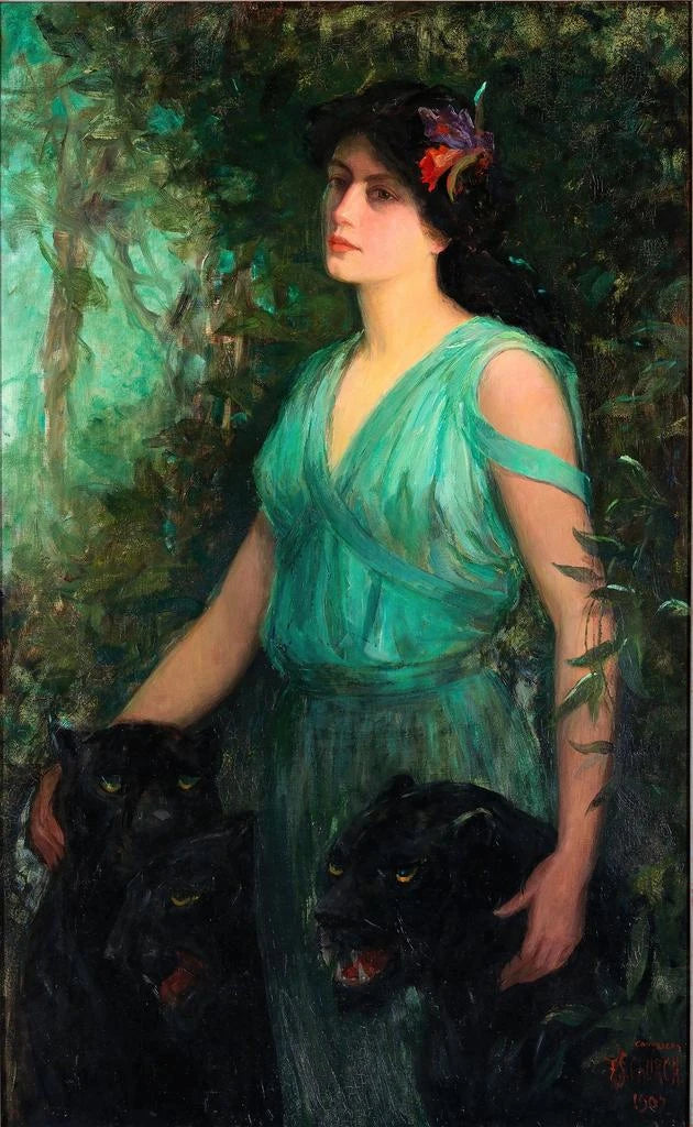 Frederick Stuart Church, actief in de 19e eeuw, wordt erkend om zijn vermogen om de schoonheid van de natuur vast te leggen, vooral door bloemrijke representaties. Geïnspireerd door de romantische beweging en reizen naar verre landen, wist hij exotische elementen in zijn werken te integreren. "L'Orchidée Noire" getuigt van zijn interesse in botanica en zijn wens om eer te bewijzen aan de bloemrijke diversiteit van de wereld. Zijn nauwgezette aanpak en oog voor detail maken hem tot een gerespecteerde kunstenaar, wiens werken blijven inspireren.